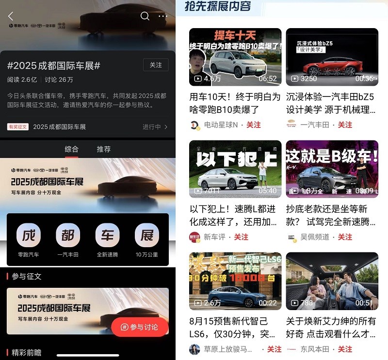 今日头条不只深度参与到了车展的热点资讯宣发,更在与汽车行业展开的营销合作中,构建了一个流量聚集+价值输出的汽车营销打法。针对零跑、一汽丰田等品牌新款热门车型量身打造一系列互动评测,围绕安全性、智驾系统、舒适性等主题方向激发全民讨论热情,多元内容击穿营销壁垒。